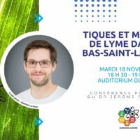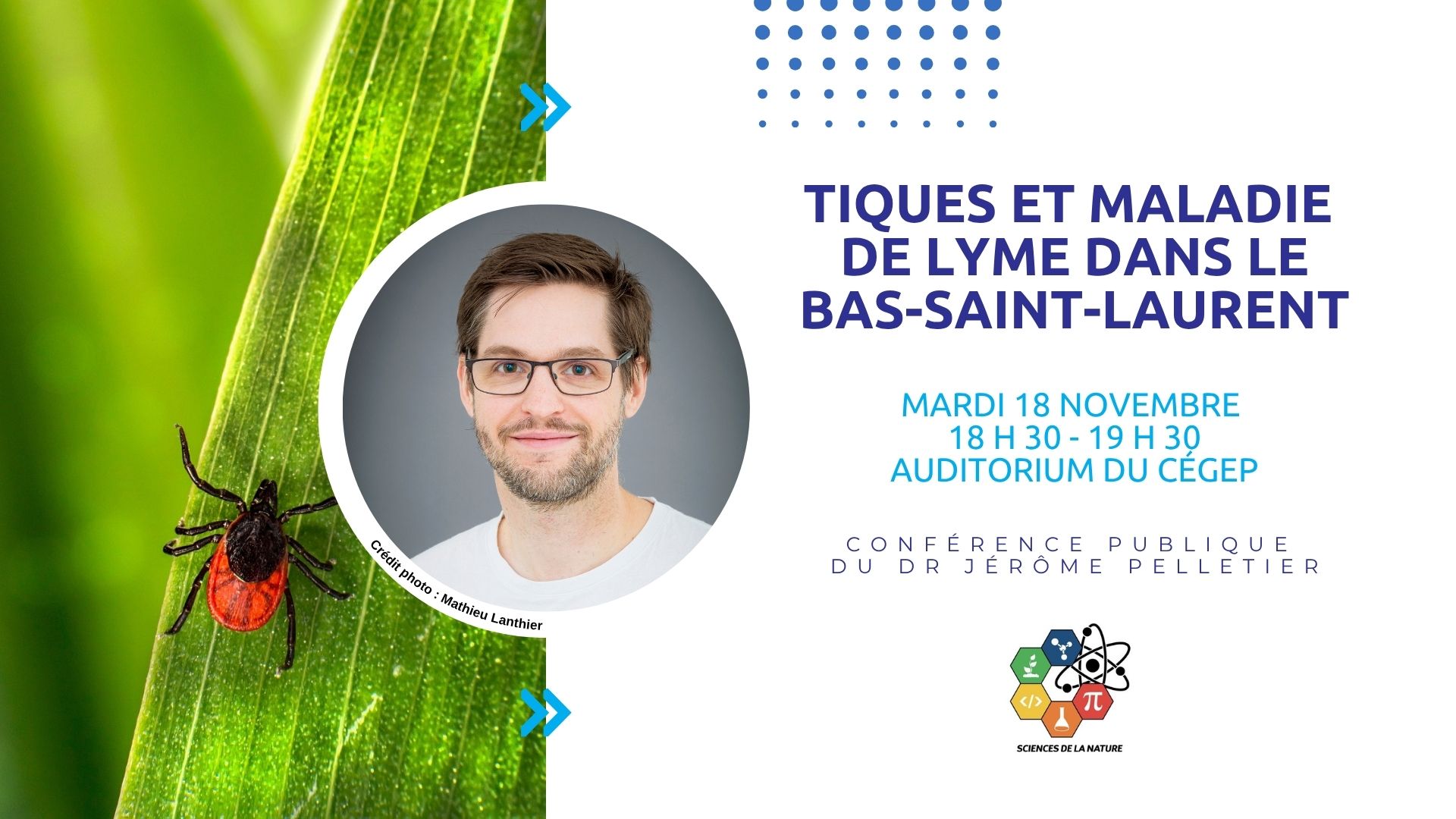 Le Département de sciences de la nature a l’honneur de recevoir la visite du Dr Jérôme Pelletier. Ce dernier, à la fois docteur en médecine vétérinaire et en sciences vétérinaires, s’est aussi spécialisé en épidémiologie. Le mardi 18 novembre, il animera une conférence gratuite et ouverte à toute la population sur la lutte contre les tiques, vectrices de la maladie de Lyme. L’événement se tiendra dans l’auditorium du cégep, de 18 h 30 à 19 h 30.